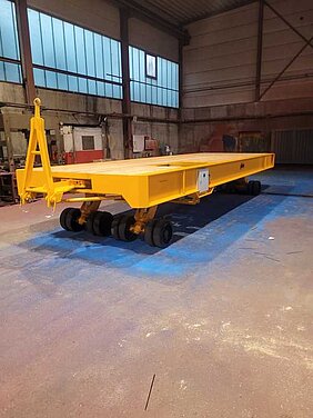 The trailer has its own hydraulic unit built into the interior of the frame and drives under machines, lifts them and moves them to the next assembly…